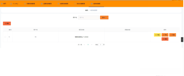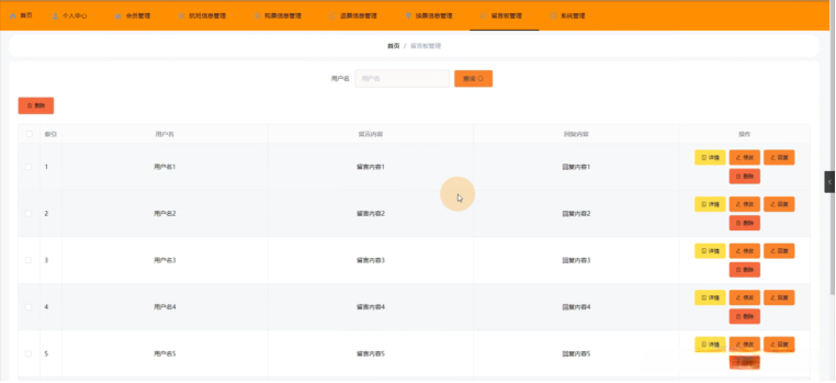 留言版块管理,在留言板管理界面里可以查询到索引信息、用户名标识以及相关的评论数据,并支持回复新消息、修改或删除现有内容等操作, 如图4-13所示
