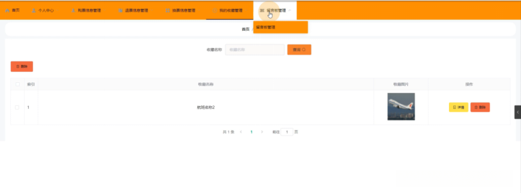 航班信息管理位于其管理界面中的列表项,在该页面上可浏览索引列表项以及详细信息如航班编号(flight number)、航班名称(flight name)、简要描述(Flight Summary)、起飞地点(Departure City)、抵达地点(Arrival City)、配图(Photo)、起飞时刻(Departure Time)、抵达时刻(Arrival Time)、座位容量(Seats)以及价格区间(Price Range)。此外还支持用户根据个人需求完成相关配图的预订,并可完成相应服务内容的调整以及服务内容的移除等操作,请参考图4-9获取更多信息。