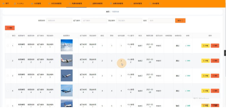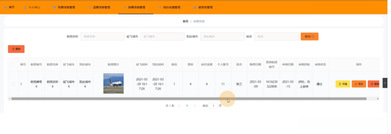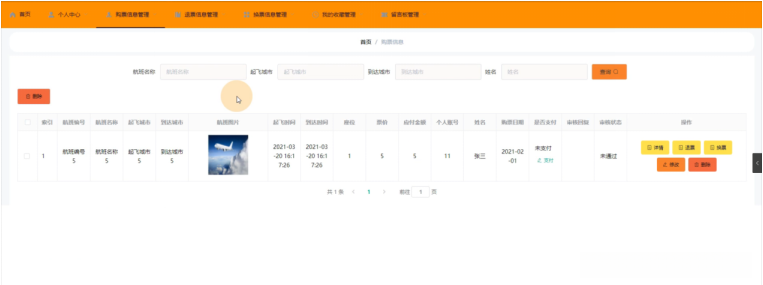 在购票信息管理页面中可以看到订单编号(索引)、航班号(航班编号)、航班名称(航班名称)、起飞城市(起飞城市)、到达城市(到达城市)、航班图片(航班图片)、起飞时间(起飞时间)、到达时间(到达时间)、座位号(座位)、票价(票价)、应付金额(应付金额)、个人账号名(个人账号)、姓名(姓名)、购票日期(购票日期)等基础信息,并根据个人需求可以选择退票/换票/修改/删除相关订单功能
