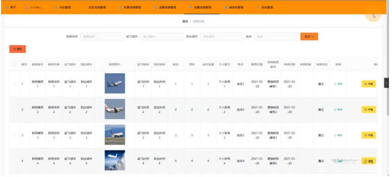 在换票信息管理页面中可以看到索引、航班编号、航班名称、起飞城市、到达城市等基本信息,并可以通过相关选项进行筛选与排序;同时支持上传航班图片以及查看起飞时间和到达时间等数据信息;此外系统还提供了座位号查询功能以及票价计算功能;用户可以根据个人需求对这些信息进行修改或删除操作,并通过系统提供的接口获取详细的审核结果等信息(如图4-12所示)。