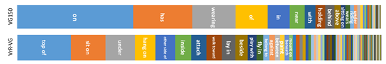 从数量对比来看,在VG150中包含87,670张图片及超过588,586个三元组;而VrR-VG则仅包含约59,983张图片及23,375个具体的关系对。这种数量上的缩减虽然显得较为激进但显著提升了数据分布的均衡性程度。