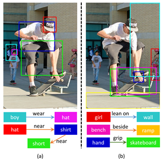 如上所示,在图(a)中展示了VG150中的一个具体场景描述;而图(b),则是经过本文所述的方法清洗后所呈现的场景图像描述(Visually-relevant Relationships in Visual Genome, VrR-VG)。实际上,在对比中我们不难发现,在(b)中各实体之间的关系类别判断相对更为困难。