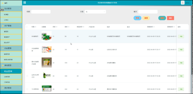 身体健康诊疗系统中的管理人员在“更多管理”这一菜单下是可以对身体健康诊疗系统内的药品管理、分类列表、订单列表进行管控的,其管理界面如下图4-9所示。