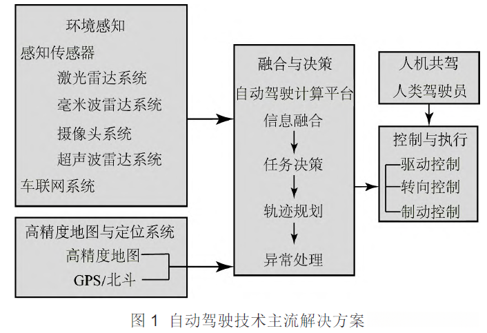 自动驾驶功能的实现,主要是依赖于环境感知传感器、自动驾驶计算平台、网联通信设施以及人机交互系统等,其主流技术解决方案如图1 所示。对于自动驾驶汽车来说,环境感知系统相当于其五官,自动驾驶计算平台则相当于其大脑,为了实现V2X 功能则需要网联通信设施,人机交互系统则是自动驾驶汽车的另一个重要的板块。