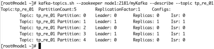 [root@node1 ~]# kafka-topics.sh --zookeeper node1:2181/myKafka --create --topic tp_re_01 --partitions 5 --replication-factor 1