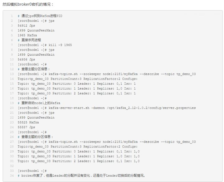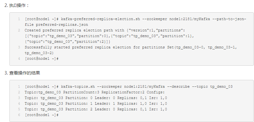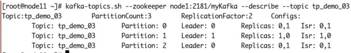 [root@node1 ~]# kafka-topics.sh --zookeeper node1:2181/myKafka --describe --topic tp_re_01Topic:tp_re_01 PartitionCount:5 ReplicationFactor:1 Configs:Topic: tp_re_01 Partition: 0 Leader: 0 Replicas: 0 Isr: 0Topic: tp_re_01 Partition: 1 Leader: 0 Replicas: 0 Isr: 0Topic: tp_re_01 Partition: 2 Leader: 0 Replicas: 0 Isr: 0Topic: tp_re_01 Partition: 3 Leader: 0 Replicas: 0 Isr: 0Topic: tp_re_01 Partition: 4 Leader: 0 Replicas: 0 Isr: 0