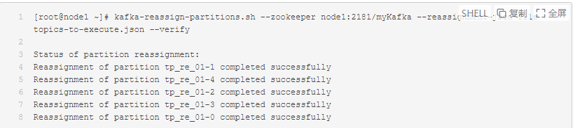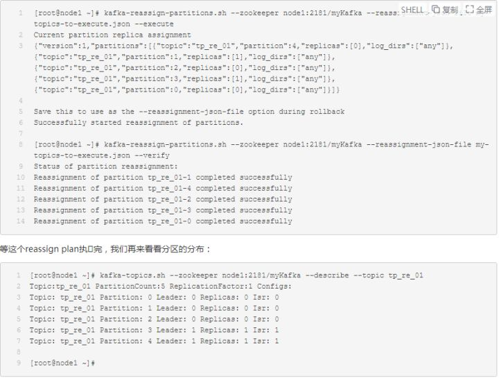 | [root@node1 ~]# kafka-reassign-partitions.sh --zookeeper node1:2181/myKafka --reassignment-json-file increase-replication-factor.json --execute | |