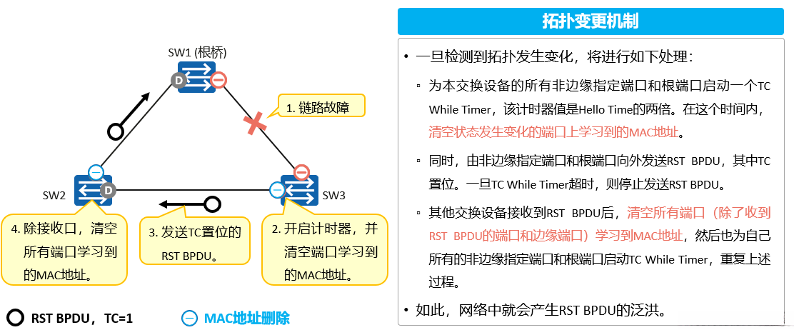 - SW2接收到RST BPDU后,会清空接收口以外所有端口学习到的MAC地址,同时开启计时器,并向外发送TC置位的RST BPDU。