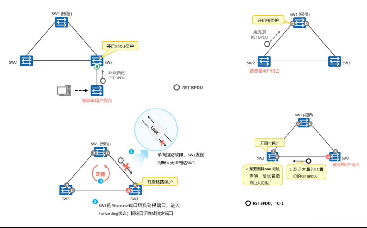 Alternate端口则会一直保持在Discarding状态(角色也会切换为指定端口),不转发报文,从而不会在网络中形成环路。 - 防TC-BPDU攻击