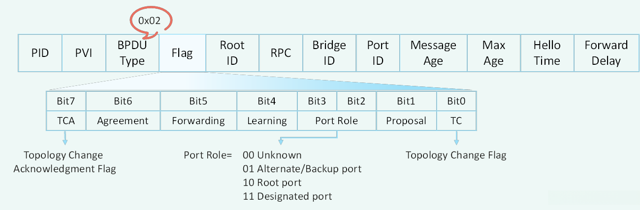 Flag字段:使用了原来保留的中间6位,这样改变的配置BPDU叫做RST BPDU。