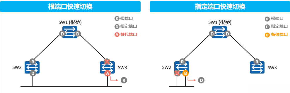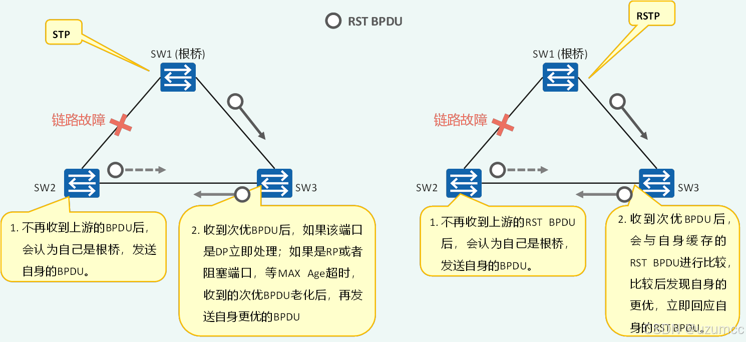 RSTP: RSTP负责处理次优BPDU报文,并不依赖于任何定时器(即不依赖于BPDU老化)来解决拓扑收敛问题;此外,在RSTP框架下,每个端口角色都会发送次优BPDU以确保网络结构的快速恢复速度。