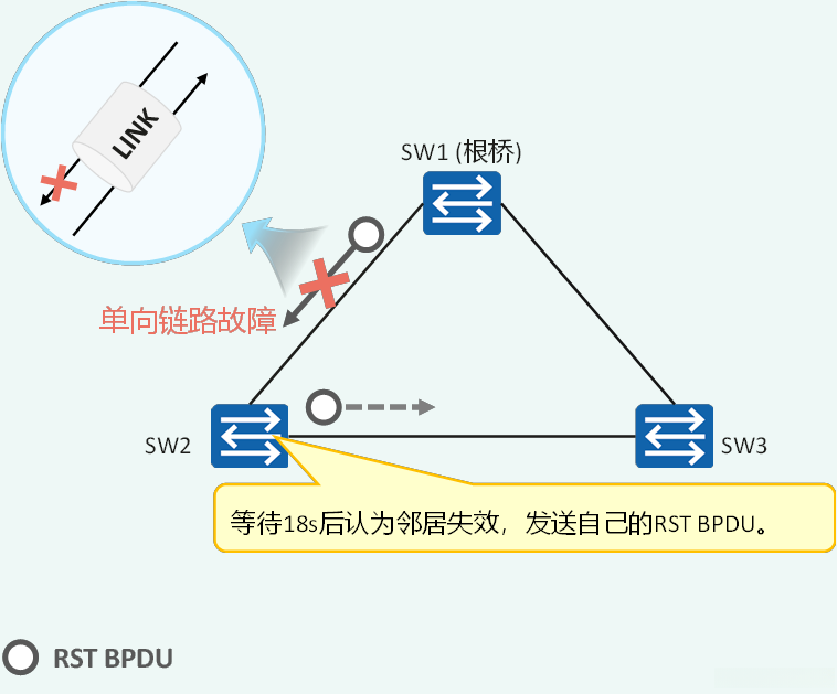 STP:在配置时钟超时时间MaxAge内未接收到上游设备发送过来的配置BPDU,则该设备将被判定为邻居失效状态