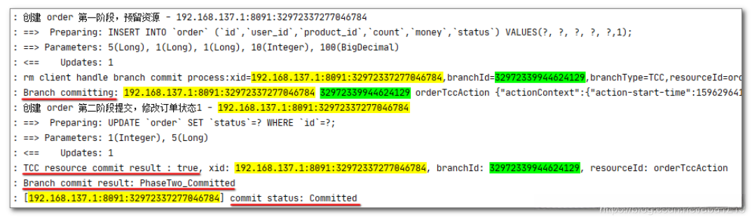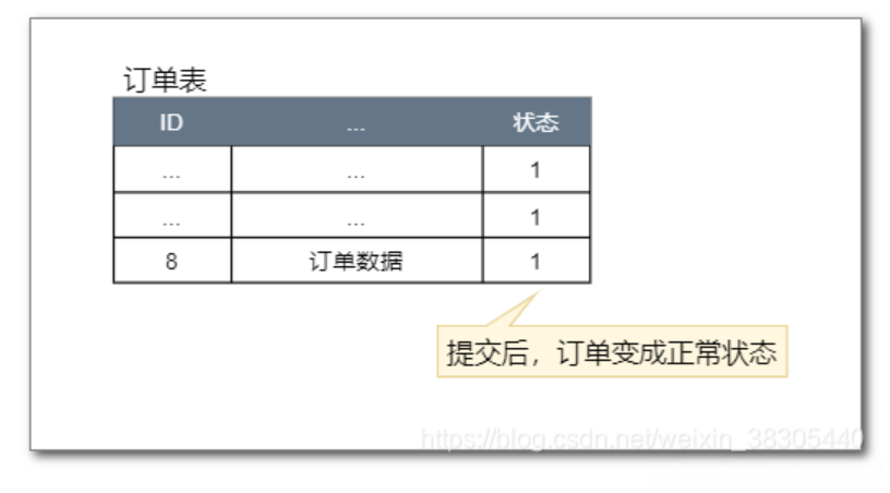 Confirm - 第二阶段,提交事务,将订单状态修改成1(正常状态)。