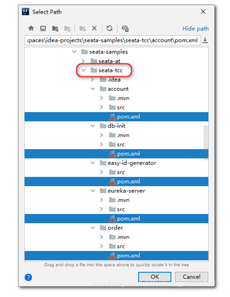 然后选择 seata-tcc 工程目录下的 7 个项目的 pom.xml 导入: