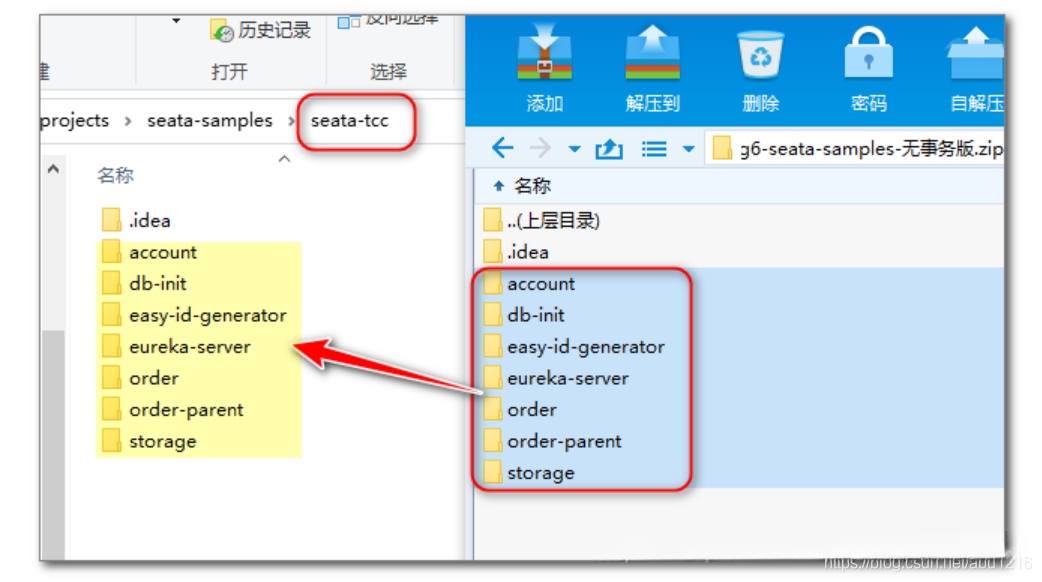 压缩文件中的 7 个项目目录解压缩到 seata-tcc 目录: