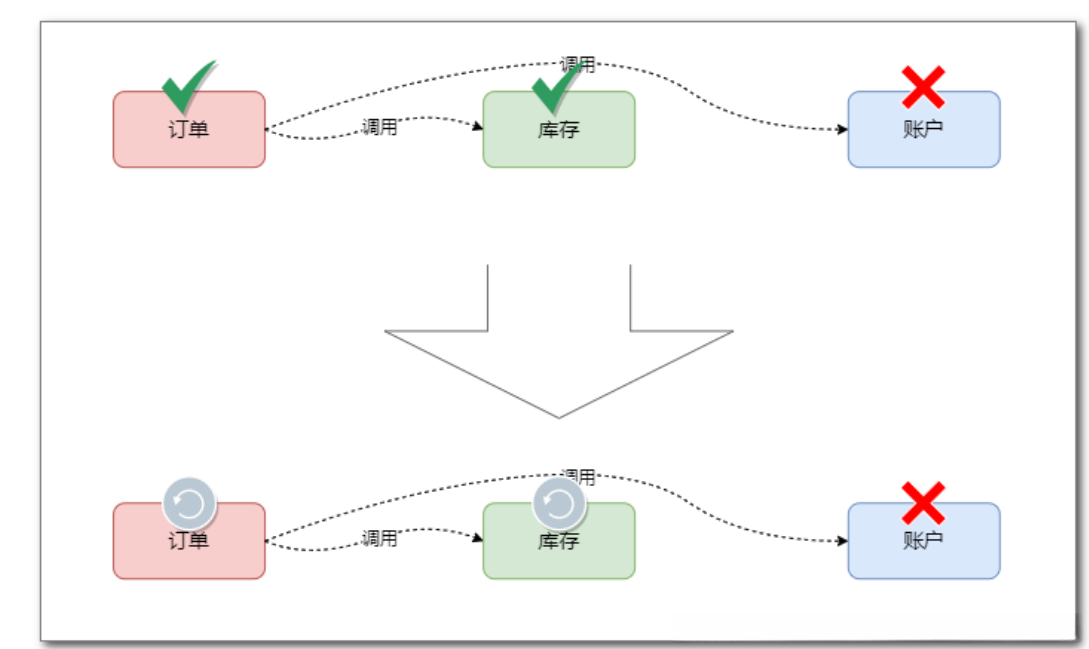 在订单与库存系统的第一个阶段实现了成功运行,在账户管理的第一阶段遇到了问题后(如图所示),系统触发了一个全局事务发生回滚