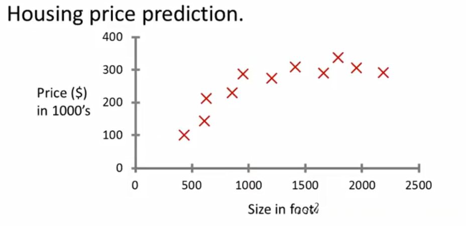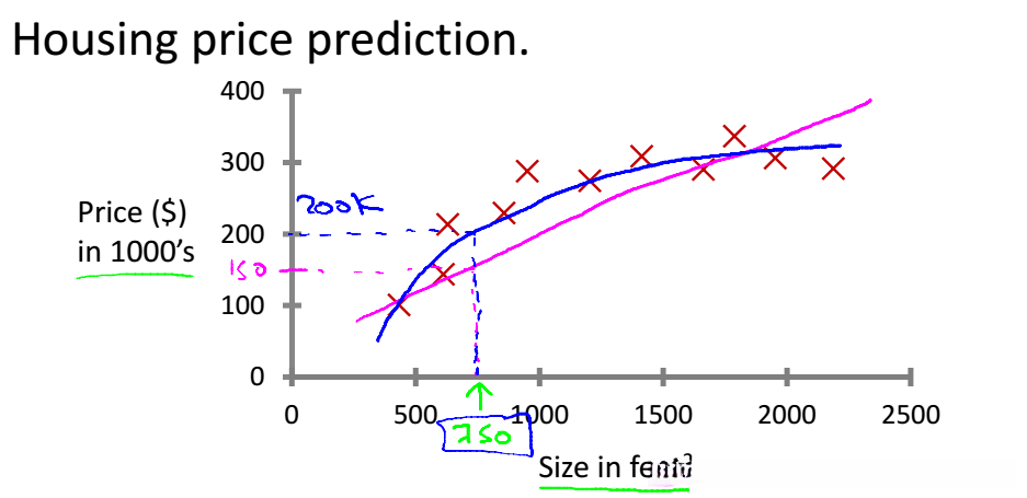 在这一副图中拟合了一条直线和一条曲线,并且给定的一个自变量(房间的大小)即可根据线条来预测输出(房价),同时在这组数据中有两个关键点: