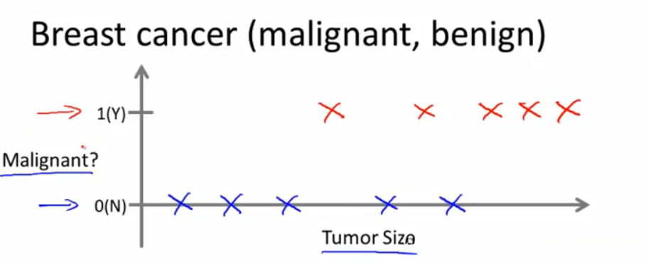 我们希望可以通过这个图来根据给定的肿瘤大小来预测良性还是恶性,我们直观上考虑用一条竖直的线来将图中的点分成两组,吴恩达视频也是这样处理的。