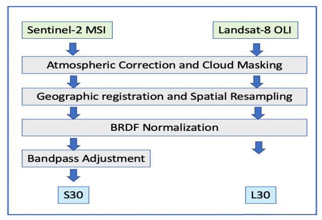 统一构建了大范围遥感观测平台——HLS项目采用了虚拟卫星传感器集群系统来实现对一致的地表反射率(SR)数据及大气层顶部亮度(TOA)数据的协调一致获取能力。其中部署于美国宇航局/美国地质调查局联合运营的第8号和第9号陆地卫星分别配备了 land成像仪(OLI),而欧洲哥白尼哨兵-2A号与2B号卫星上则部署了多光谱仪(MSI)。基于综合监测技术可每隔2至3天实现对全球地面区域每30米的空间分辨率进行观测。该系统整合了一套先进的算法系统以确保OLI与MSI输出的数据能够无缝对接这一体系包括但不限于大气校正处理云层遮挡与云影遮蔽消除以及空间基准统一等关键环节还涉及统一的空间划分策略光照均匀校正与视角优化等技术环节最后还包括了针对不同光谱通道的滤波优化工作以提升整体观测质量