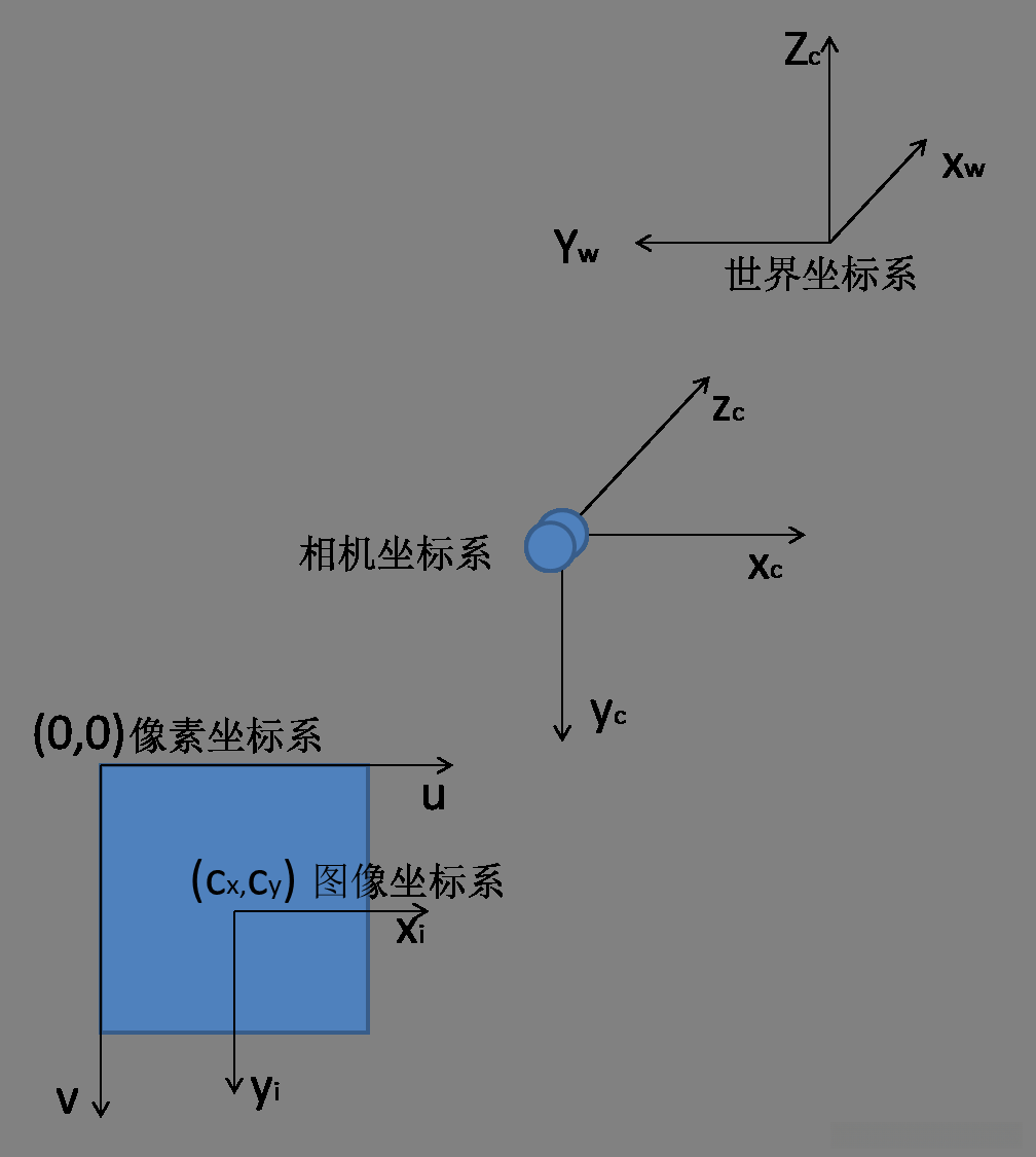 - 图像坐标系 为2维平面,平面在相机焦平面,原点在图像中心;