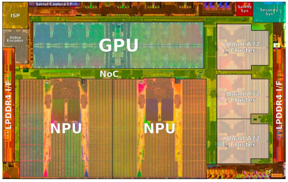 聚焦其中一颗 SoC(FPGA系统开发)来深入分析其硬件架构配置。实际上可以看出该架构由 CPU(右侧一组 ARM Cortex-A72 四核处理器)+ 两个 NPU(神经处理单元)+ 一个异构型 GPU 组成,在这种异构型架构中 GPU 主要负责图形图像算法处理(同时其旁边还有一个 Video Encoder H.265 视频解码模块用于中控台显示行车记录仪数据),而 NPU 则承担神经网络算法处理任务;CPU 则负责整体控制功能。值得注意的是在传统意义上的 GPU 更擅长执行深度学习算法加速任务而在这里 NPU 的比重明显较高并且其主要职责趋向于存算一体类脑芯片角色以实现车辆自主学习功能;因此形成了以 GPU 固定算法计算与 NPU 自主学习协同工作的 '互补模式' 这种架构设计使得车辆在应对复杂多变的自动驾驶场景时感知能力得到了显著提升。