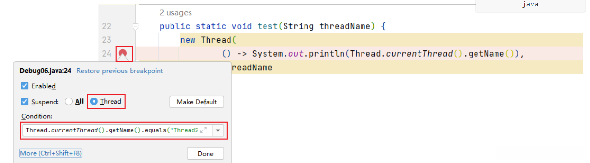 断点设置在方法的签名上,默认当进入时,断点可以被唤醒。
