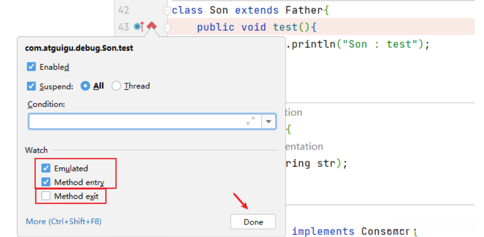 在多态的场景下,在父类或接口的方法上打断点,会自动调入到子类或实现类的方法