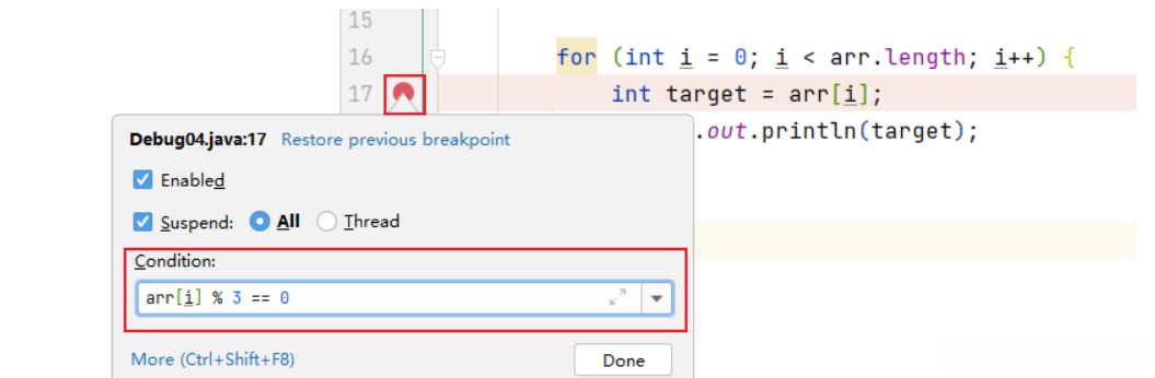 针对上述代码,在满足arr[i] % 3 == 0的条件下,执行断点。
