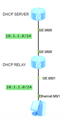 当我们的DHCP服务器端点与客户端设备不在同一网络段时,则必须使用DHCP中继设备来实现通信连接的建立。以示例形式展示一个最简单的拓扑结构图,请注意图中所展示的仅为一个典型案例。其他拓扑结构则更加灵活。