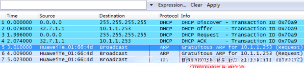 此时虽已dhcp工作的四个阶段全部完成,但通过捕获数据包仍可见到有三次arp报文在ack响应完成后发送出去,它们的作用是用来检测是否存在ip地址冲突的情况.若有冲突,则会重新进行ip地址的获取.若无冲突,则dhcp流程至此结束.