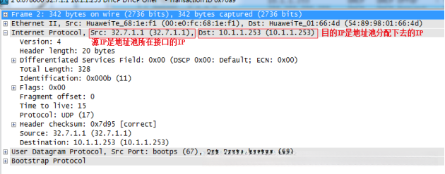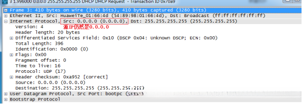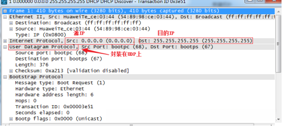 在抓包过程中观察到,在DHCp协议中发现其Discover报文采用分层结构封装于UDP之上;其源IP地址为全零地址(IPv4中的默认本地广播地址),目的IP则配置为 reserved multicast address。