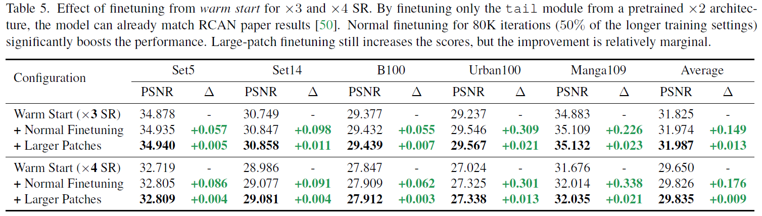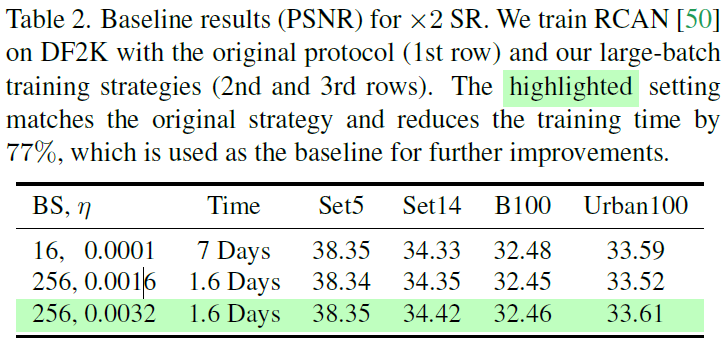 ### 训练策略 #### 大batchSize优化器 原始的RCAN训练策略是使用Adam优化器,小的batchSize($BS=16$),小的学习率($\eta=10^{-4}$)。这个训练组合收敛缓慢,大概需要在单个GPU上收敛$7$天。所以作者先使用多GPU训练,以支持大的batchSize。由于梯度更新下降的总数减少,所以应用了一个**线性缩放规则** :mini-batchSize放大了$k$倍,那么学习率也乘以$k$倍。 为了训练稳定性,作者使用$Lamb$优化器,这是一种专为大批量(large-batch)训练而设计的分层自适应优化器。同时还使用余弦退火代替了原始的多步学习率调度器,其唯一超参数就是迭代(或epochs)的总数。通过采用这些技术,作者有效地将batchSize大小增大了$16$倍,并通过并行性大大节省了训练时间。  #### 更长的训练 作者发现(如下图左所示),RCAN在baseline训练管道要结束的时候,RCAN的验证集PSNR指标仍在提高,这表明仍存在欠拟合问题。所以增加训练迭代次数,可以有效地减轻欠拟合问题。  #### 大patchSize进行finetune 在Swinir有验证,**使用更大patchSize的patch能提高性能** 。 但增大输入的长宽尺寸会带来GPU内存的急剧上升,导致训练耗时增加,甚至在硬件预算上不可行。 所以,作者将训练管道分为了两个阶段,(1)正常的patchSize尺寸($48\times48$);(2)更大的patchSize尺寸($64\times64$)用于finetune,同时使用更少的迭代次数。在更大的patchSize尺寸时,为了满足GPU内存,会缩小batchSize。 #### 正则化技术 测试了一些数据增强技术,mixup,随机深度,随机翻转和通道打乱(channel shuffle)。mixup使用Beta($0.15,0.15$)来生成随机插值权重。对于随机深度,作者使用$0.5$的概率随机跳过一个残差块。 尽管增加正则化可以有效地提高图像识别大模型的性能,但作者发现RCAN并不能从正则化中收益。因为**它会出现欠拟合,而不是过拟合** 。 #### 热启动 RCAN对于$\times2,\times3,\times4$模型的主体结构是一样的,除了最后的预测模块(一个卷积和pixel shuffle)。所以可以使用$\times2$的权重为$\times3$模型和$\times4$模型进行初始化。 训练的时候,由于尾部的预测模块不同。所以可以先将主体结构进行冻结,只finetune尾部的预测模块(速度快,只需要不到$1$小时),然后再一起finetune整个模型。 ## 论文实验 ### 原论文实验管道和超参数更变 使用DF2K数据集用于训练,DF2K由DIV2K和Flickr2K组成,总共3550张图像。验证集为Set5、Set14、B100、Urban100、Manga109。指标评价选择PSNR和SSIM。指标评估的颜色空间为YCbCr空间的Y通道。损失函数都采用$L1$函数。使用随机水平和垂直翻转 模型选择的是RCAN,有$10$个残差组(residual groups, RG),每个残差组有20个残差模块和一个卷积层。所有卷积层的通道数为$64$,除了输入和上采样层。 原始训练策略是batchSize为$16$,学习率为$\eta=10^{-4}$,优化器为Adam($\beta_1=0.9,\beta_2=0.999$),训练$1725K$次迭代,每经过$20\%$次迭代衰减一半的学习率。 本文的训练策略更改为batchSize为$64$,学习率$\eta$使用线性所发规则。为了训练的稳定性,将Adam优化器更改为Lamb优化器。原始训练策略使用1张V100的GPU,作者使用4张。经过了$80K$次迭代,训练了1.6天。 由下表的对比可以看出,如果学习率$\eta$是严格遵守线性缩放规则($0.0016=\frac{256}{16}*10^{-4}$),那么对比原有的管道,会有指标上的性能差异。但如果使用$2*10^{-4}$作为起始点,即$0.0032=\frac{256}{16}*2*10^{-4}$,那么就有和原始管道相近的性能,但只使用$23\%$的时间。所以,本文的baseline超参数为$BS=16,\eta=0.0032$。需要注意的是,这个RCAN指标是比原论文高的。因为其使用了更大的数据集(DF2K),原文只使用了DIV2K数据集。黑盒测试数值,无实际参考意义。  另外,作者注意到 ,**使用更大的学习率会造成训练的不稳定** 。比如当$\eta=0.0064$时,在大约$2K$次迭代之后,会陷入无法收敛阶段(NaN)。当$\eta=0.0048$时,在大约$16K$次迭代后会陷入无法收敛阶段(NaN)。 ### 训练管道修改 #### 消融学习 下表展示了**架构修改、训练策略修改、正则化变化** 的消融学习。 对PSNR指标的增长有用的训练策略调整为:激活函数从ReLU改为SiLU,更长的训练周期(训练RCAN共$160K$,是baseline的两倍),使用更大patchSize输入进行finetune。这三个更改,对五个验证集都有指标的提升,且是相互独立的。三个更改平均能带来$0.042dB$的提升。  同时,从上表可以看出,一些**数据增强,都是会降低验证集的PSNR指标的** 。 #### 集成效果 三个训练策略的组合带来的指标效果如下表所示:组合起来也带来提升。最后一行 **_Oracle_** 结果,是在每个测试集上分别finetune的结果,也就是过拟合的结果,用以查看RCAN的上限值的。本文最好的RCAN效果和Oracle对比,仍有$0.388$的PSNR指标差距。这表明,**即使使用相对“过时”的RCAN架构,仍有很大的改进空间。**  另外,已知Set5数据集有JPEG伪影,Manga数据集由漫画图像组成(合并本封面,是彩色的)。 #### 相关训练结果 warm start的训练,以及扩大训练迭代次数的结果如下表。  RCAN、RCAN-it与当时其他的SOTA超分算法进行定量对比。   在公开数据集上的可视化对比。  具体来说,RCAN-it 重建了具有更高对比度的条带图案,而其他方法往往会产生不切实际的伪影(图 3,第 4 行)。 此外,在以前的模型中可以消除背景对比度较低的结构,而本文的 RCAN-it 可以保留它们(图 3,第一行)。 请注意,除了激活函数的小修改之外,RCAN-it 与现有方法相比,只需更好的训练即可重建高频细节,而不是引入专门用于学习高频分量的新模块或结构。