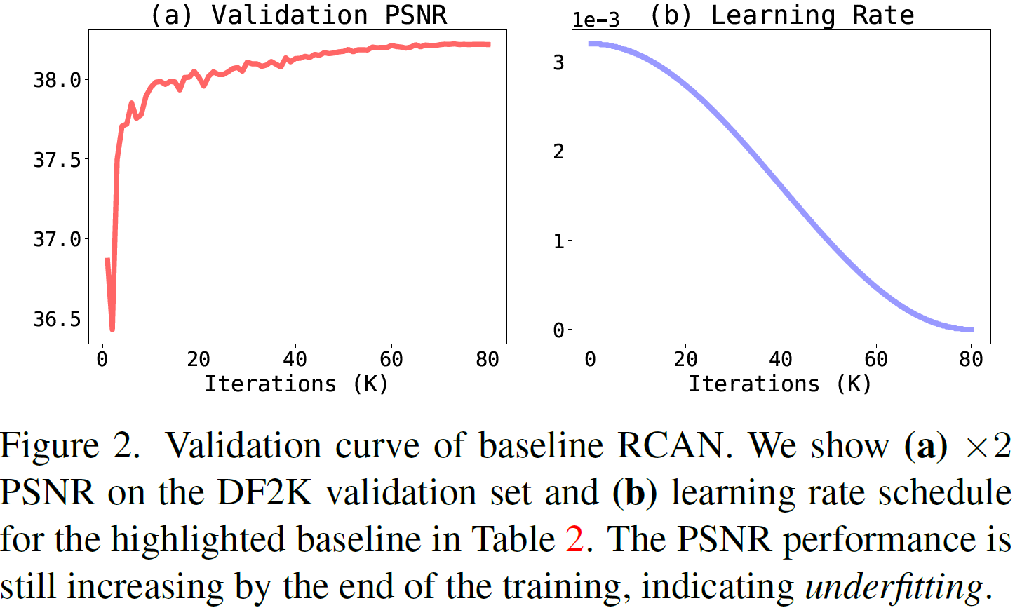 在广泛使用的DF2K数据集上,作者发现模型性能受限于欠拟合而不是过拟合 。所以,作者基于这个观察,可以得出几个结论: