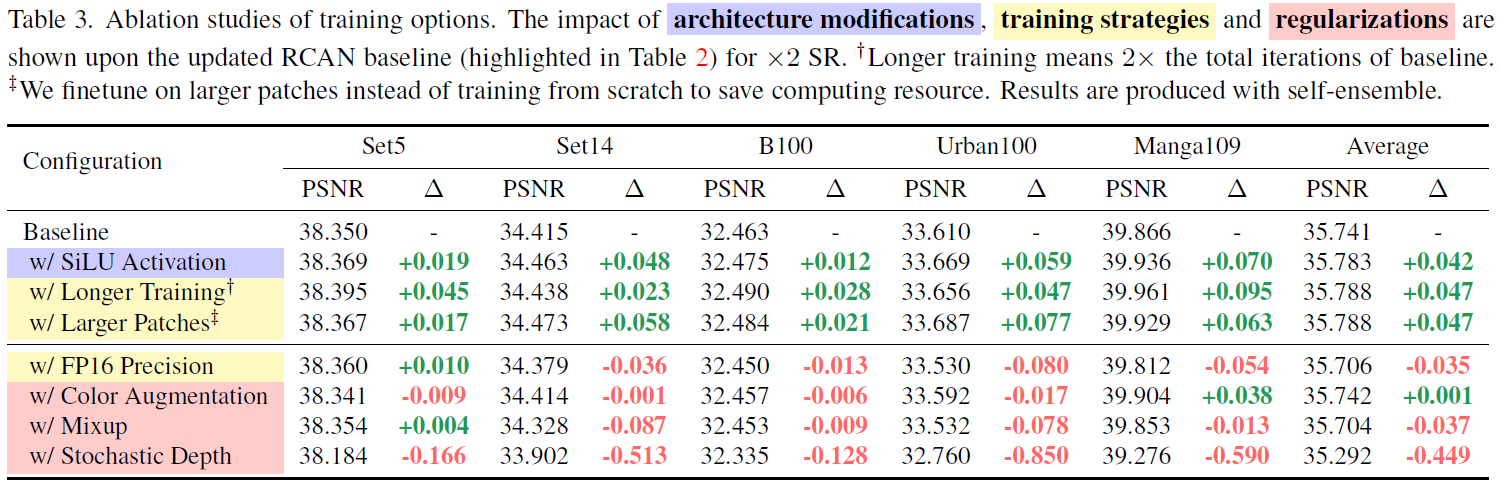 首先,简单地增加训练迭代次数可以明显提高分数,而正则化技术通常会降低SR模型的性能 。