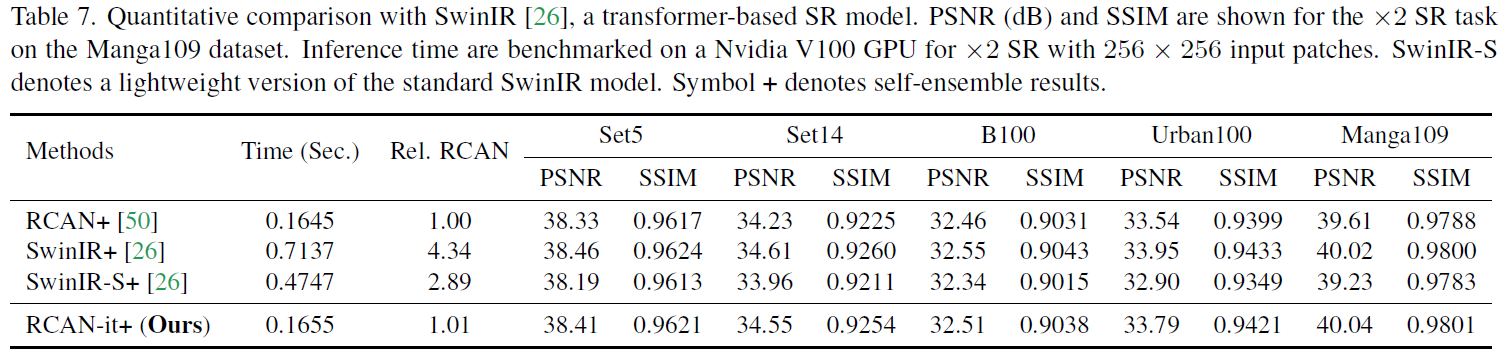 通过更先进的训练策略,本文使用RCAN,在Manga109数据集的\times2任务上得到了0.44 dB的PSNR值提升,达到了39.88dB。这个指标已经足够优秀,可以媲美或者超过SOTA算法,比如CRAN和SwinIR。