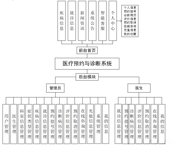 系统整体模块分为管理员、医生和用户三大用户角色,整体功能设计图如下所示: