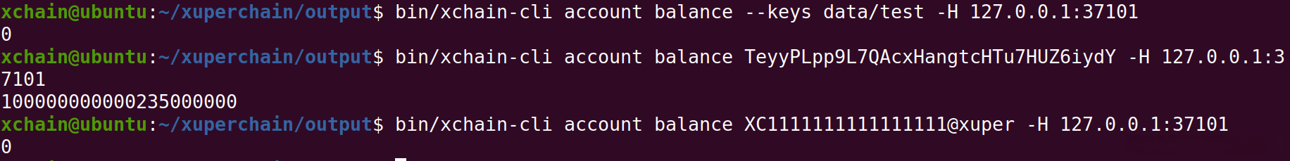 bin/xchain-cli account balance XC1111111111111111@xuper -H 127.0.0.1:37101