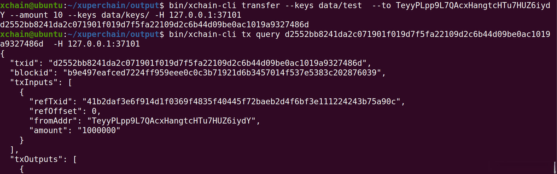 bin/xchain-cli tx query d2552bb8241da2c071901f019d7f5fa22109d2c6b44d09be0ac1019a9327486d -H 127.0.0.1:37101