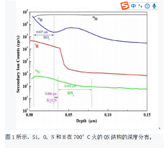 SIMS用于检测存在于样品中的原始元素以及不必要的el元素,例如碳类杂质,在整个样品结构中分布均匀. 图1展示了该ON样品经SIMS分析后的结果,在700°C下持续30分钟暴露于氮气环境中.