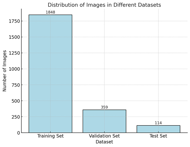 训练数据集包含 1,848 个样本(共 1,677 副图像),以实现model的学习与调优目标。验证数据集共有359个样本(约296副图像),旨在检验model对新data的适应能力,并防止overfitting。测试数据集包含114个样本(约96副图像),主要用于全面评估model的generalization performance.