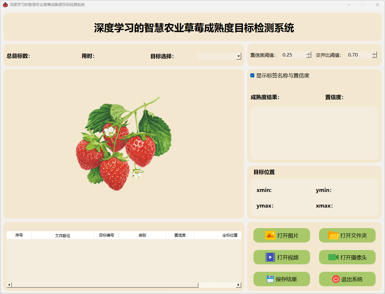检测结果:通过摄像头与系统的实时数据流获取信息,并识别出草莓成熟度的图像,并将识别结果反馈出来。动态呈现摄像头的画面,并对行为位置进行标记定位;统计数据显示,在每帧画面中都有详细的监测记录