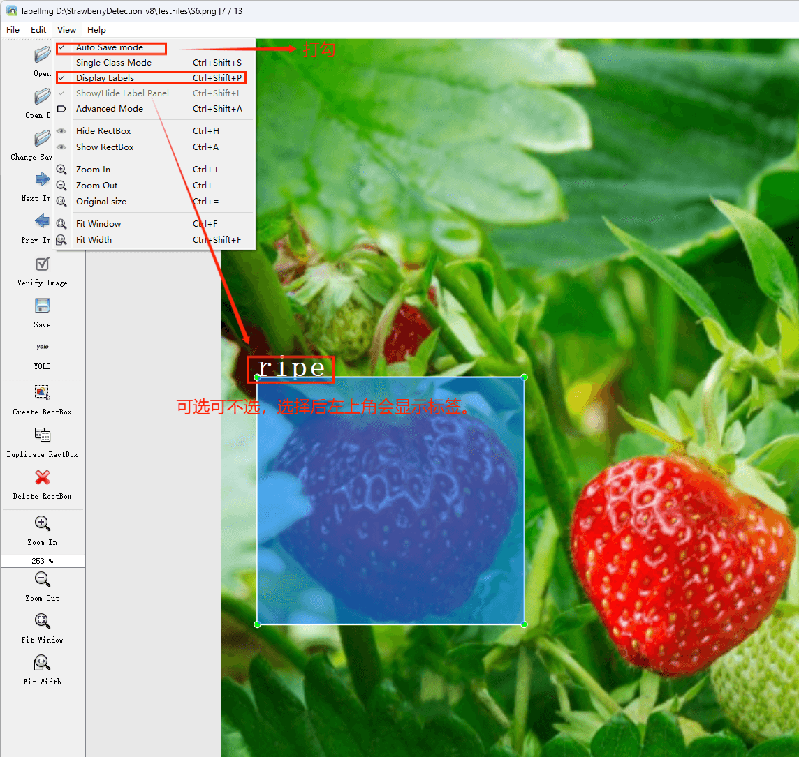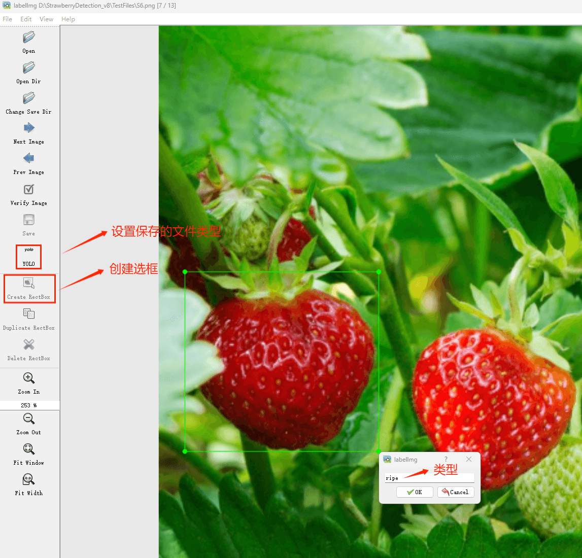 Tipps:为了收集多样化的皮肤病理相关图像,并采用Labelimg标注工具对每张图片进行标注,在二分类检测任务中识别出'草莓成熟'与'草莓未成熟'两类。