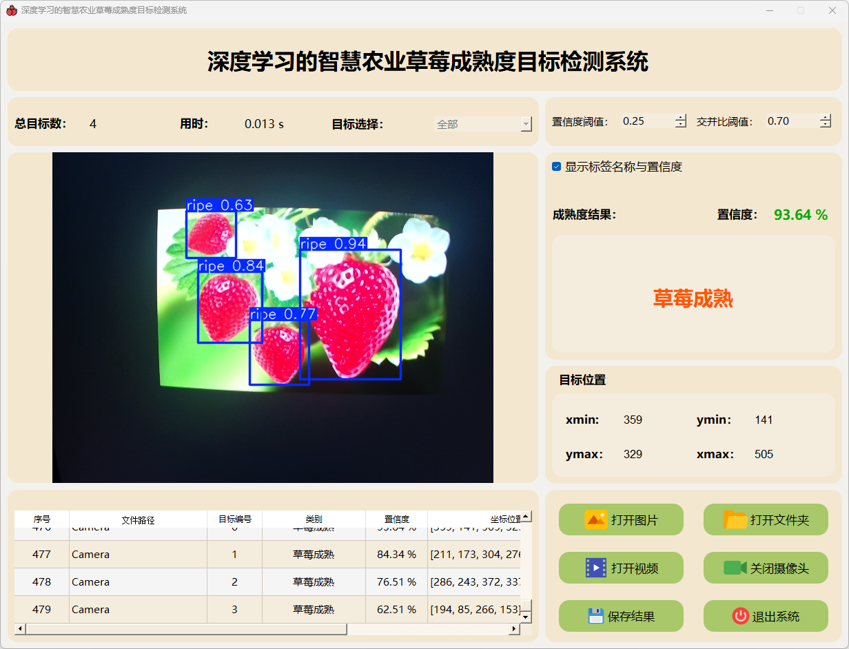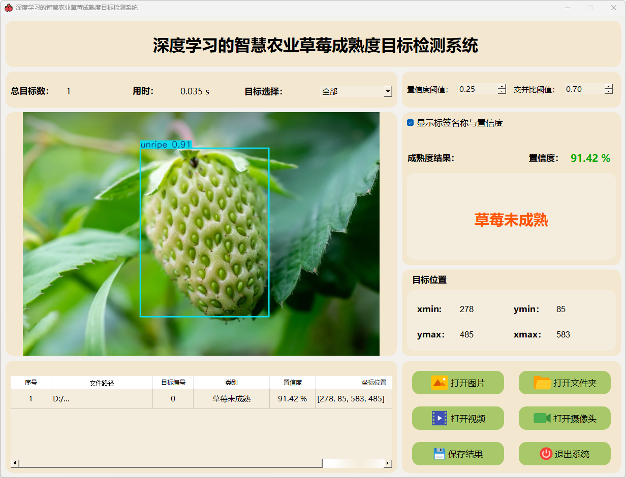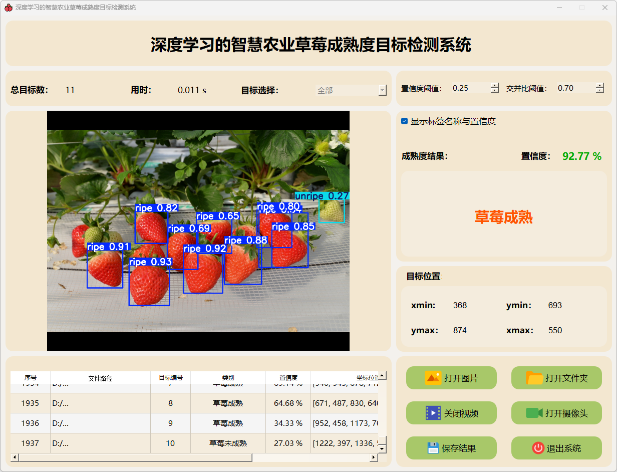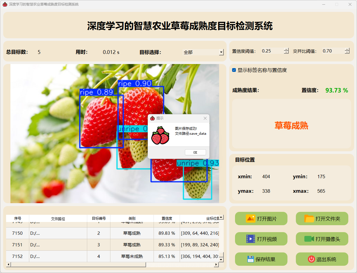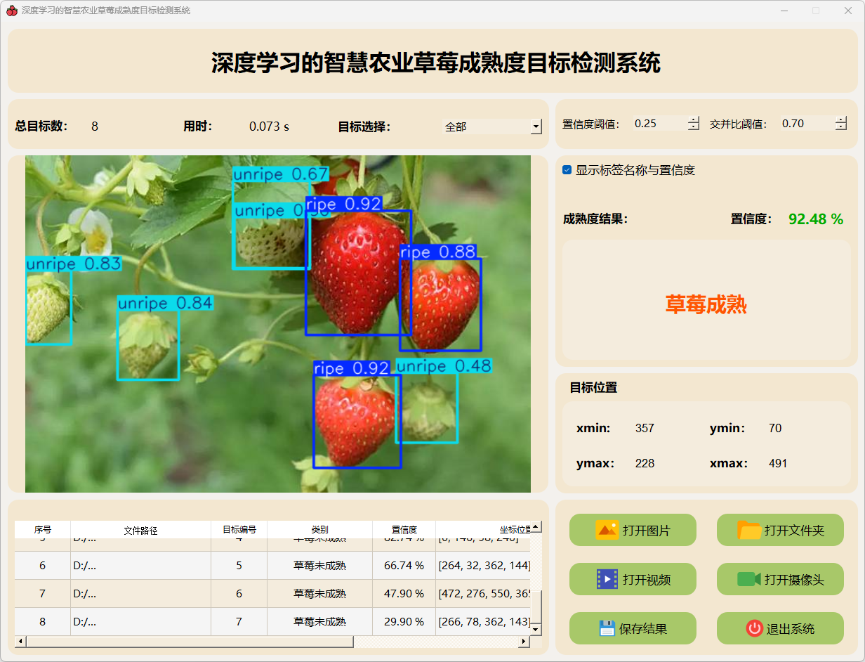 该界面呈现了系统在视频帧处理中的多目标检测能力。它不仅具备精准的判断能力,并能准确识别出草莓成熟度的图像特征。同时提供丰富的检测数据以及相应的可信度评估结果。
