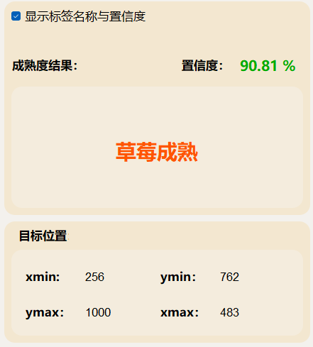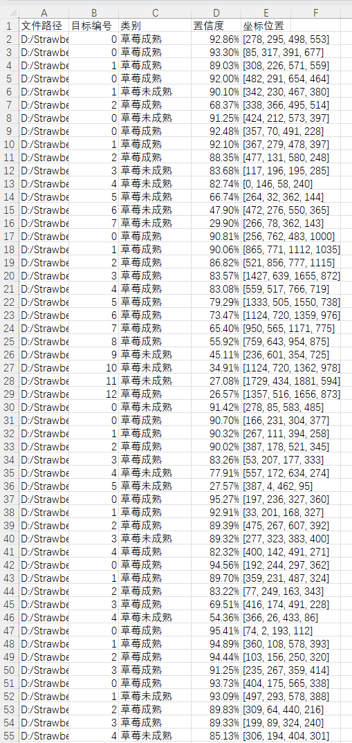 这些坐标值对应于图像中的目标区域范围,并确定了检测到的'草莓成熟'的位置。