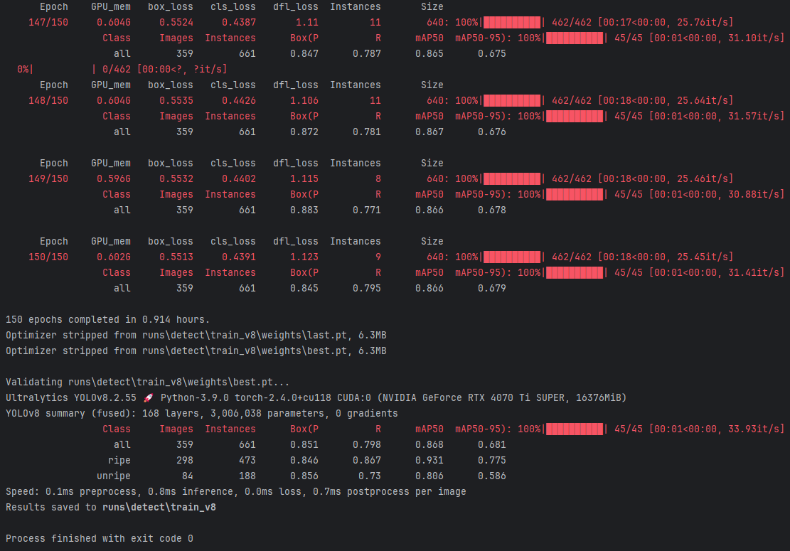 (1)经过了150轮的训练周期后, 模型总耗时为 0.914 小时。