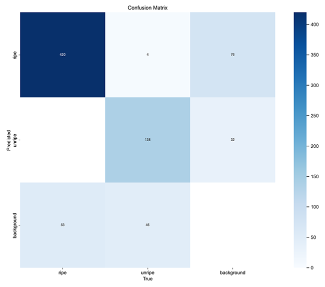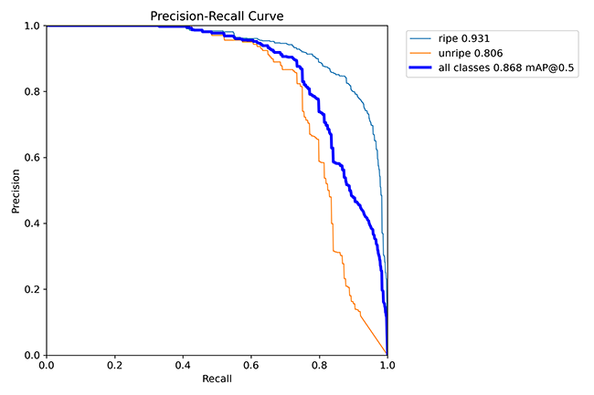 该模型在草莓成熟度检测方面表现出色,在成熟的草莓类别上特别突出其精确度和召回率均达到较高水平,并具备实用价值。