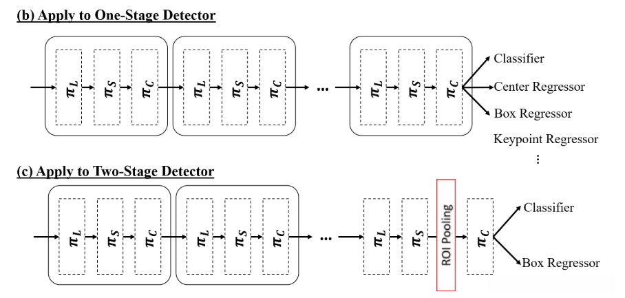 最后要注意的是在两阶段检测器的应用中,πC放在了ROI Pooling之后,使用任务感知注意力替换原来的全连接层,以支持分类和回归等不同的任务。