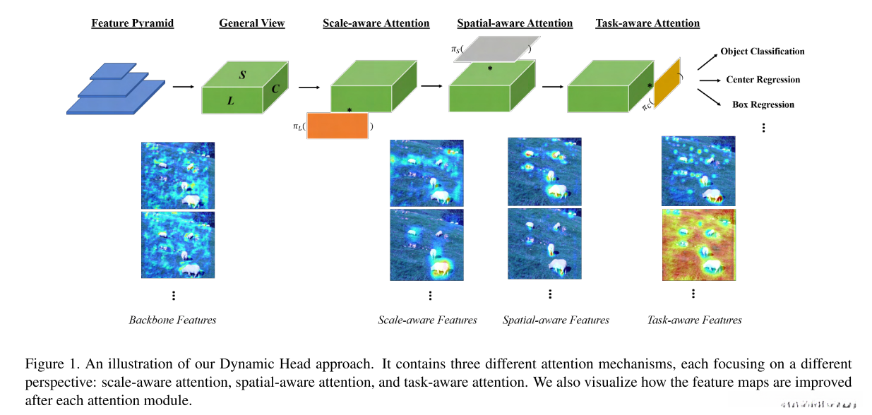 摘要:目标检测中定位与分类相结合的复杂性导致了各种方法的蓬勃发展。以前的工作试图提高在各种目标检测头部的性能,但未能呈现一个统一的视图。在本文中,我们提出了一种新的动态头部框架来统一目标检测头部和注意力。通过在尺度感知的特征层次之间 、空间感知的空间位置之间 以及任务感知的输出通道内 连贯地组合多种自注意机制,该方法显著提高了目标检测头的表示能力,且不增加任何计算开销。进一步的实验证明了该方法在COCO基准上的有效性和有效性。使用标准的ResNeXt-101-DCN骨干网,我们大大提高了流行的目标检测器的性能,并实现了54.0 AP的新技术。——总结就是:feature levels for scale-awareness , among spatial locations for spatial-awareness , and within output channels for task-awareness.