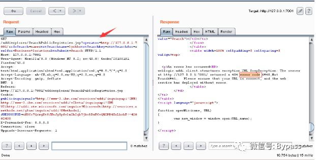 参数operator为SSRF的可控参数,将其更改为开放的端口,如http://127.0.0.1:7001/,将返回error code