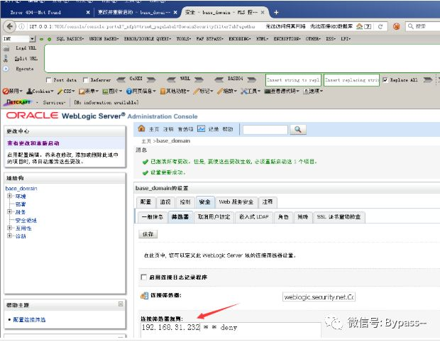 连接筛选器填: weblogic.security.net.ConnectionFilterImpl 保存后重启Weblogic.